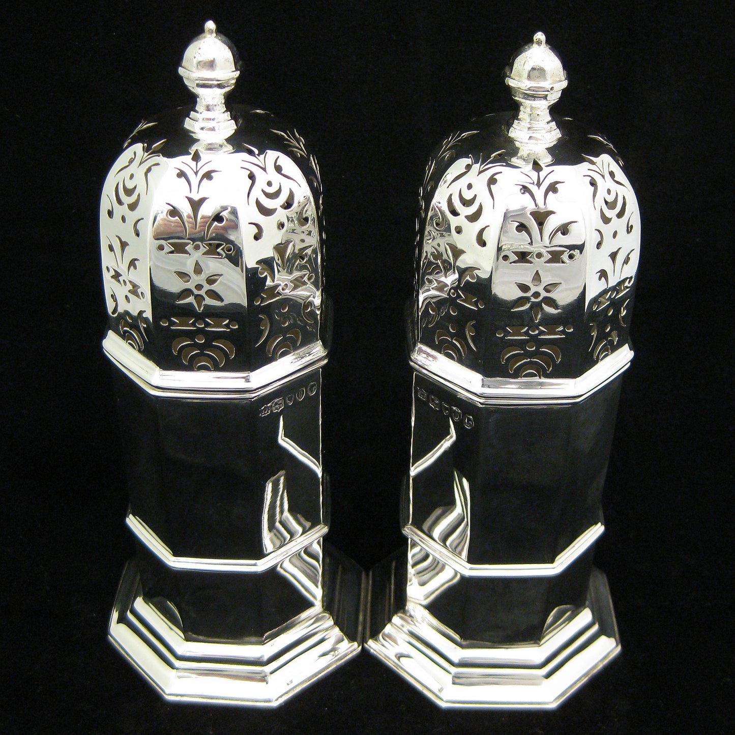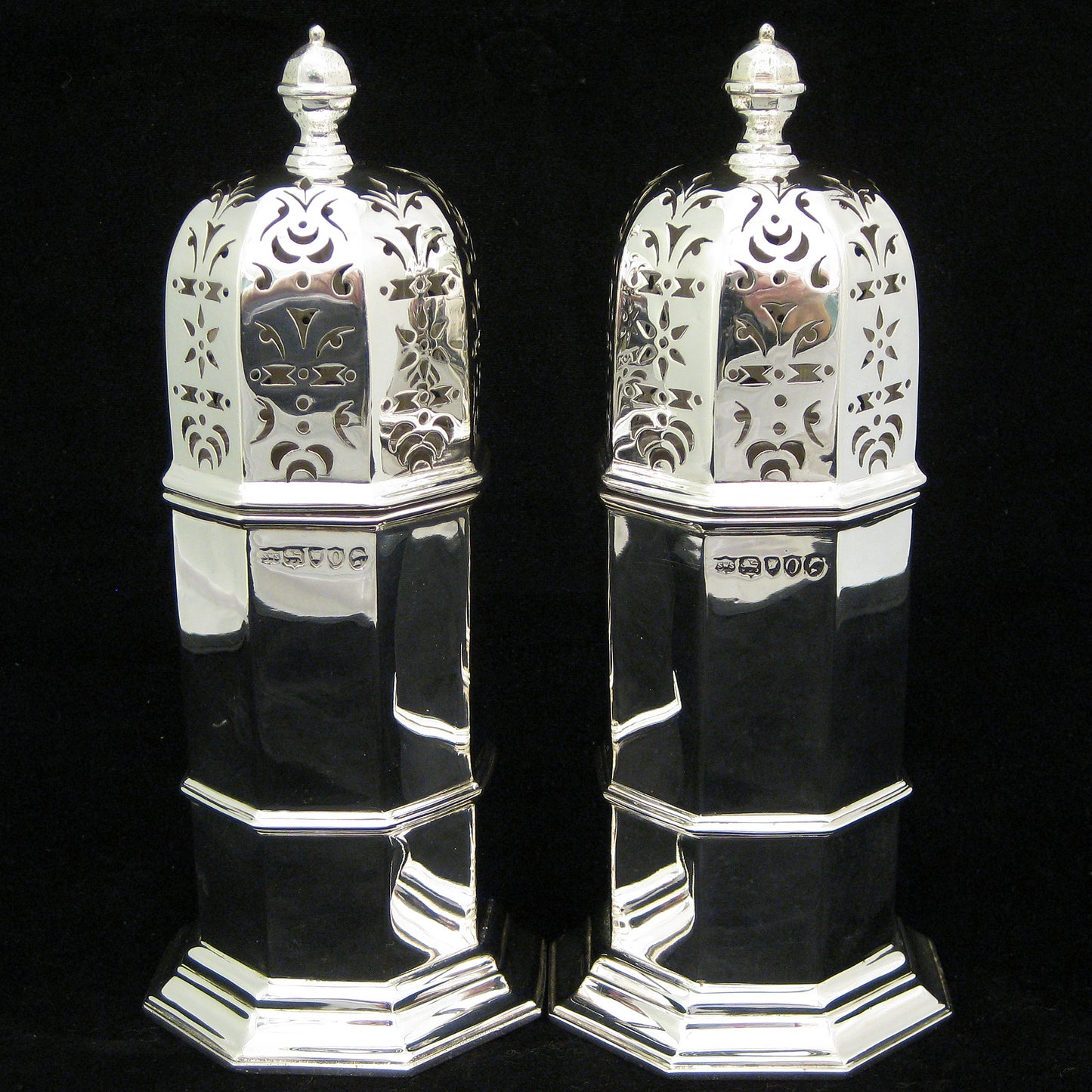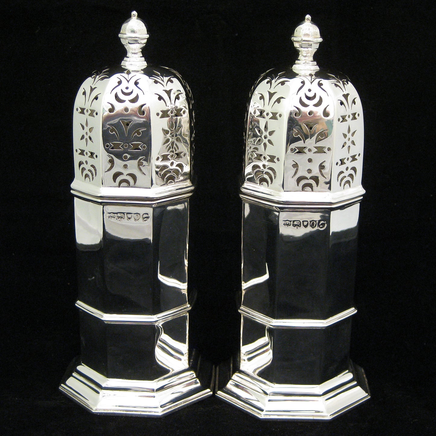 These are are octagonal pillar in style ,they have delicately pierced lids for sprinkling and an octagonal finial top .The interiors are pristine.