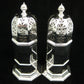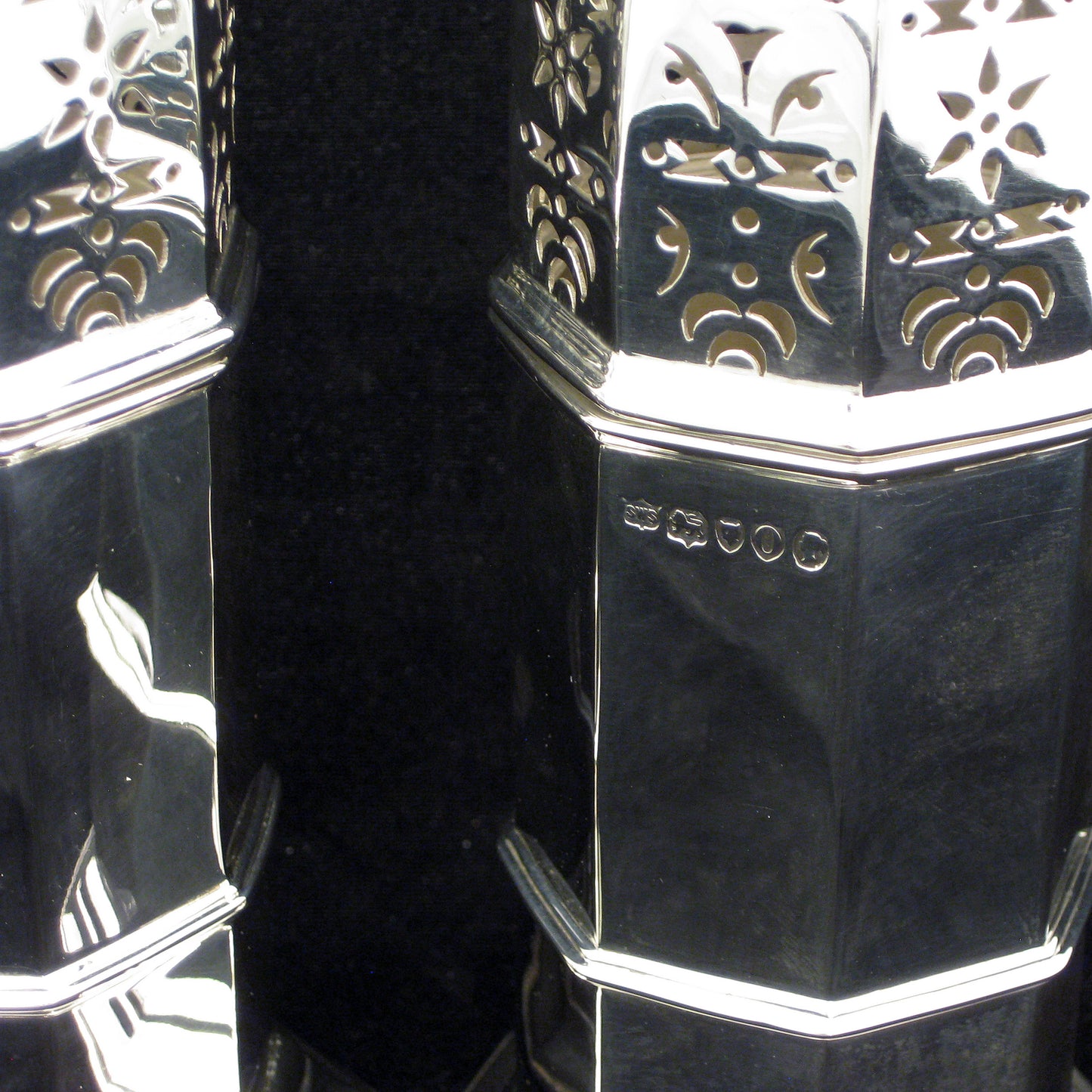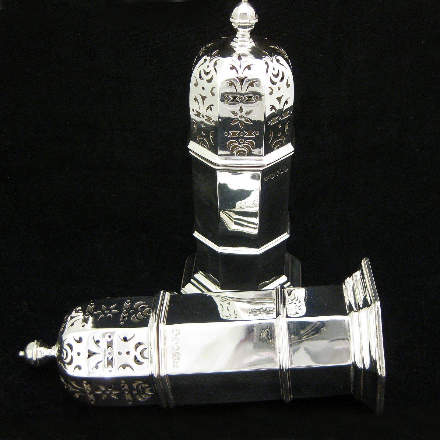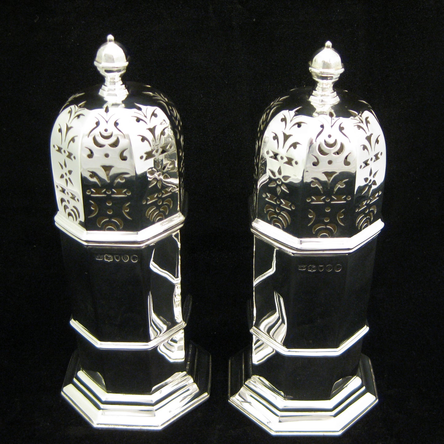These are are octagonal pillar in style ,they have delicately pierced lids for sprinkling and an octagonal finial top .The interiors are pristine.