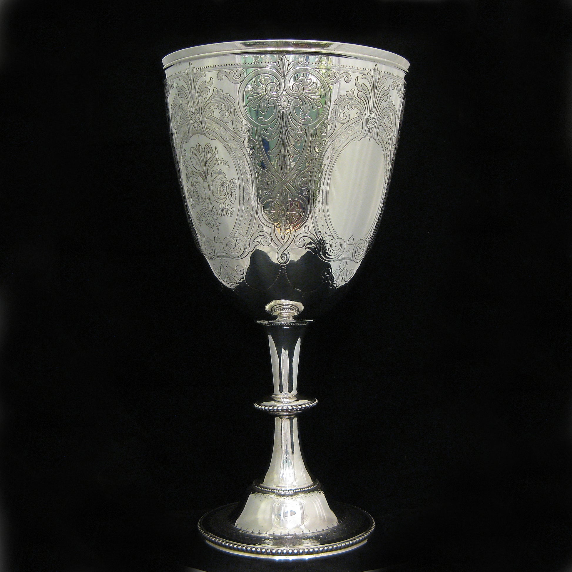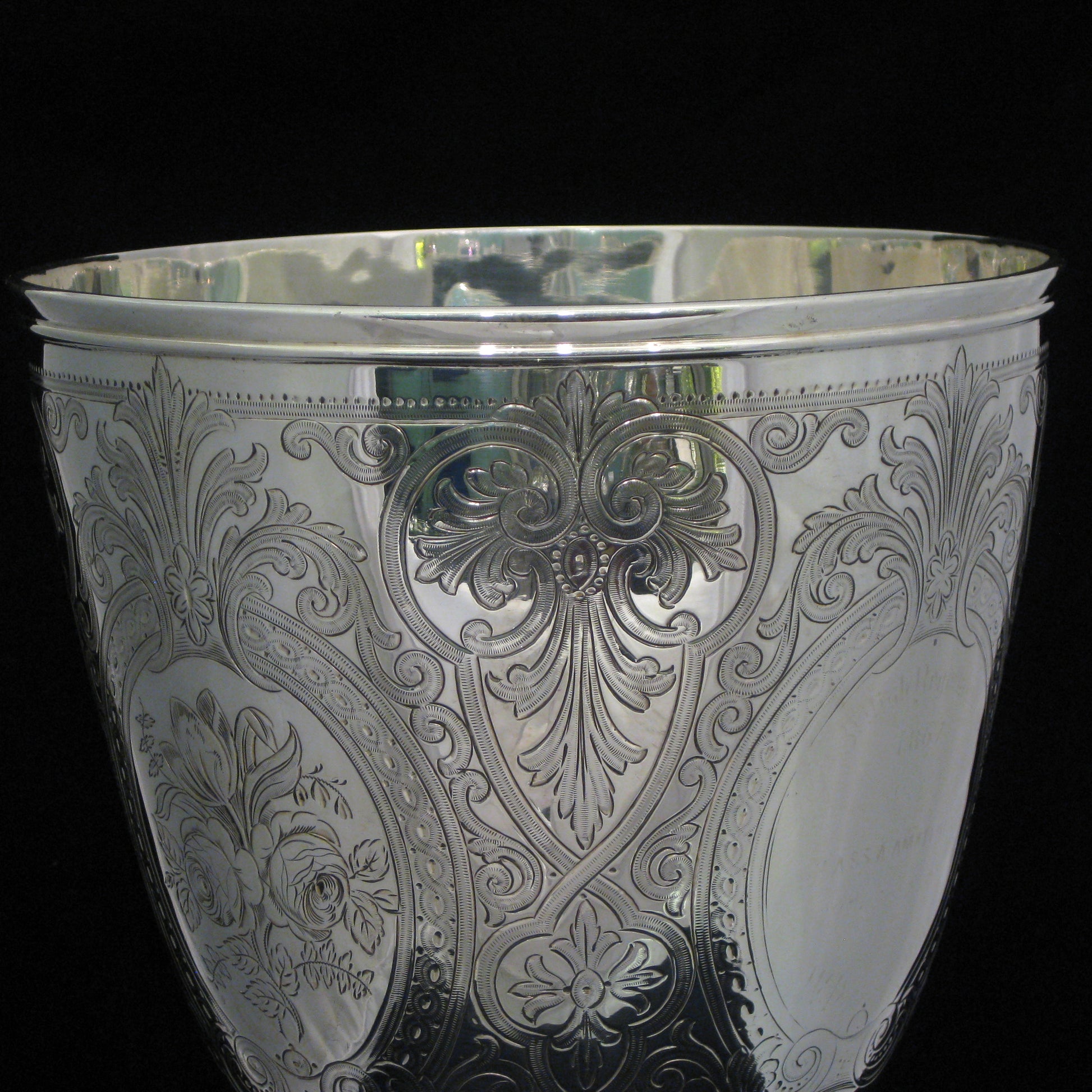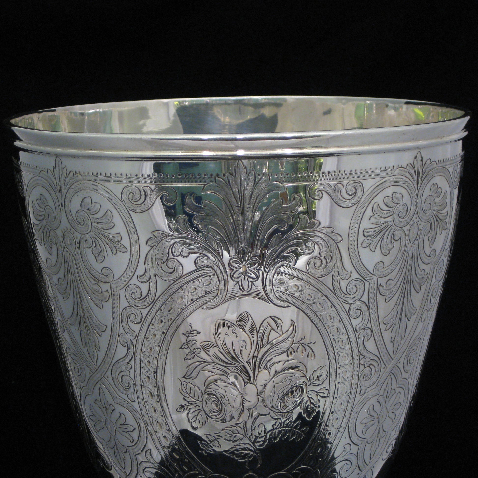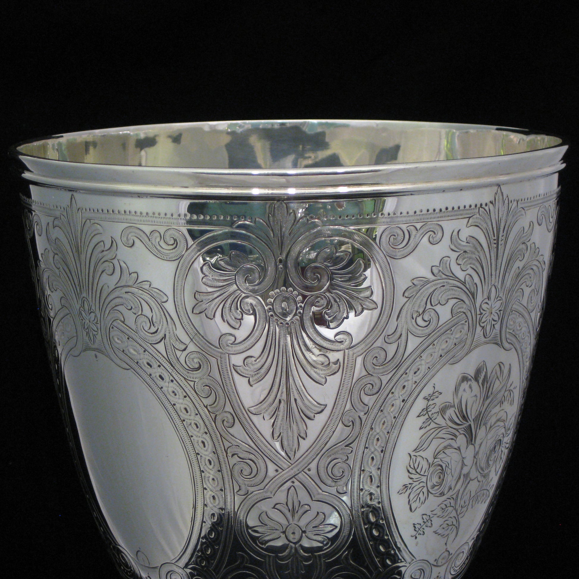 Delicately and finely hand chased with a detailed floral and geometric pattern with roses and two blank cartouche areas.