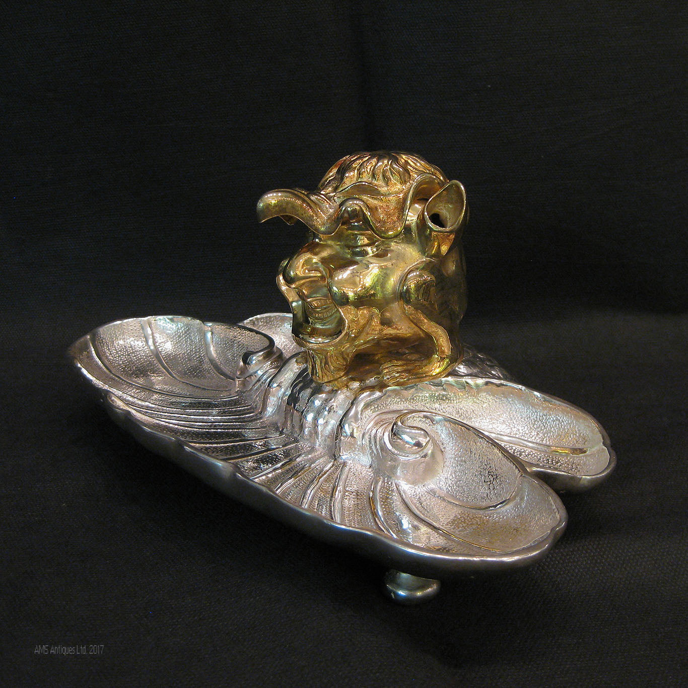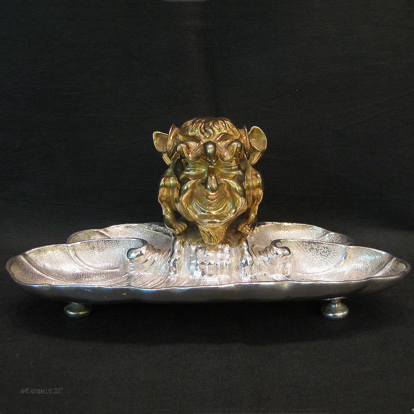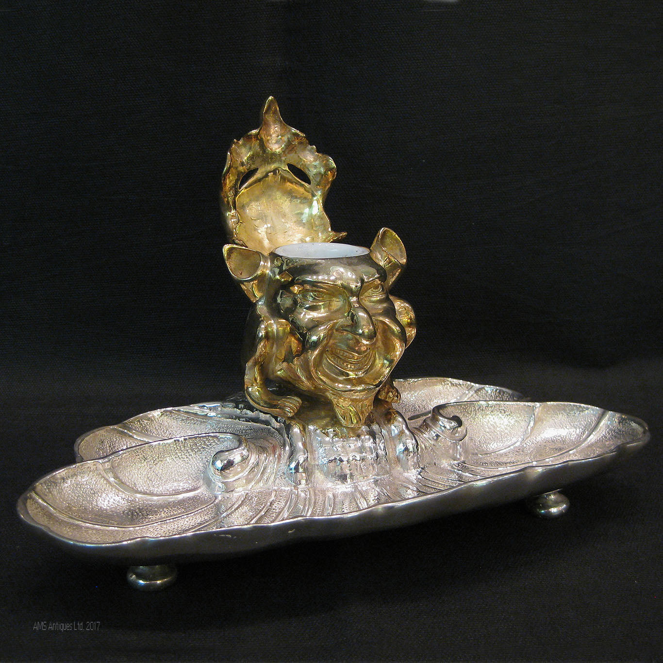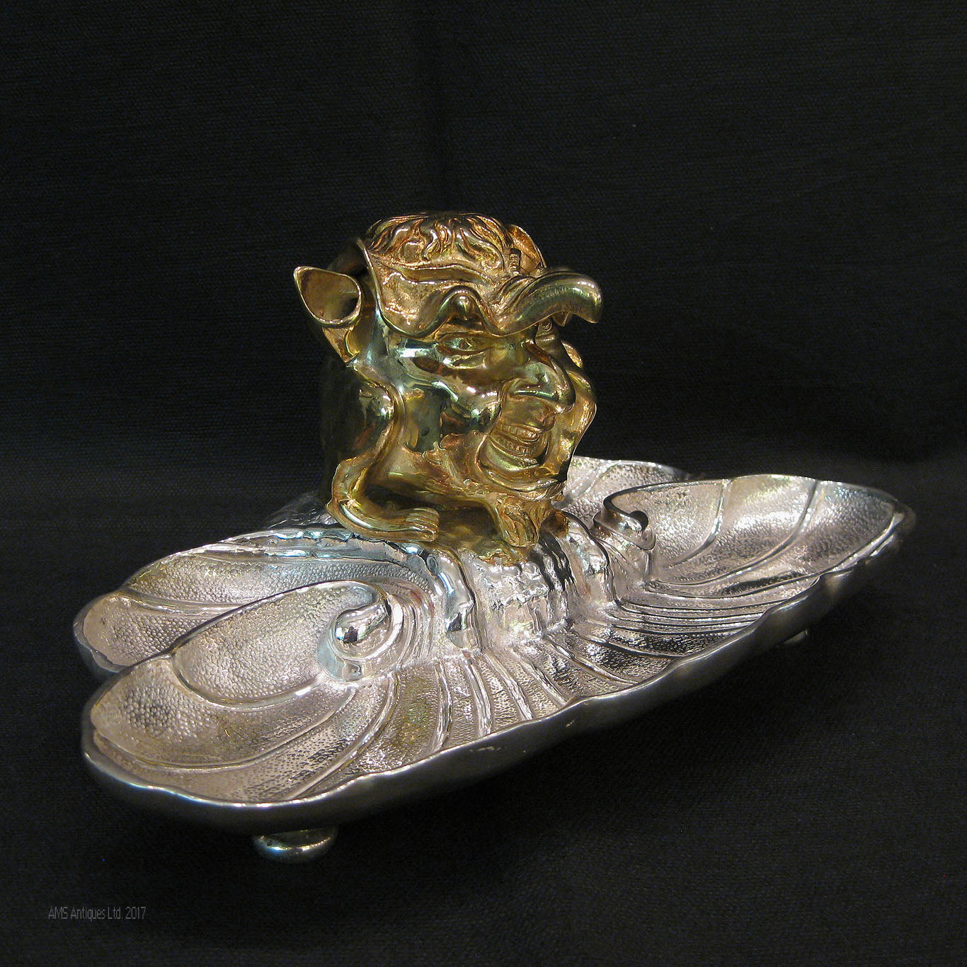 An unusual and collectable ink stand featuring a mythological Irish figure atop of a shell scrolled base.