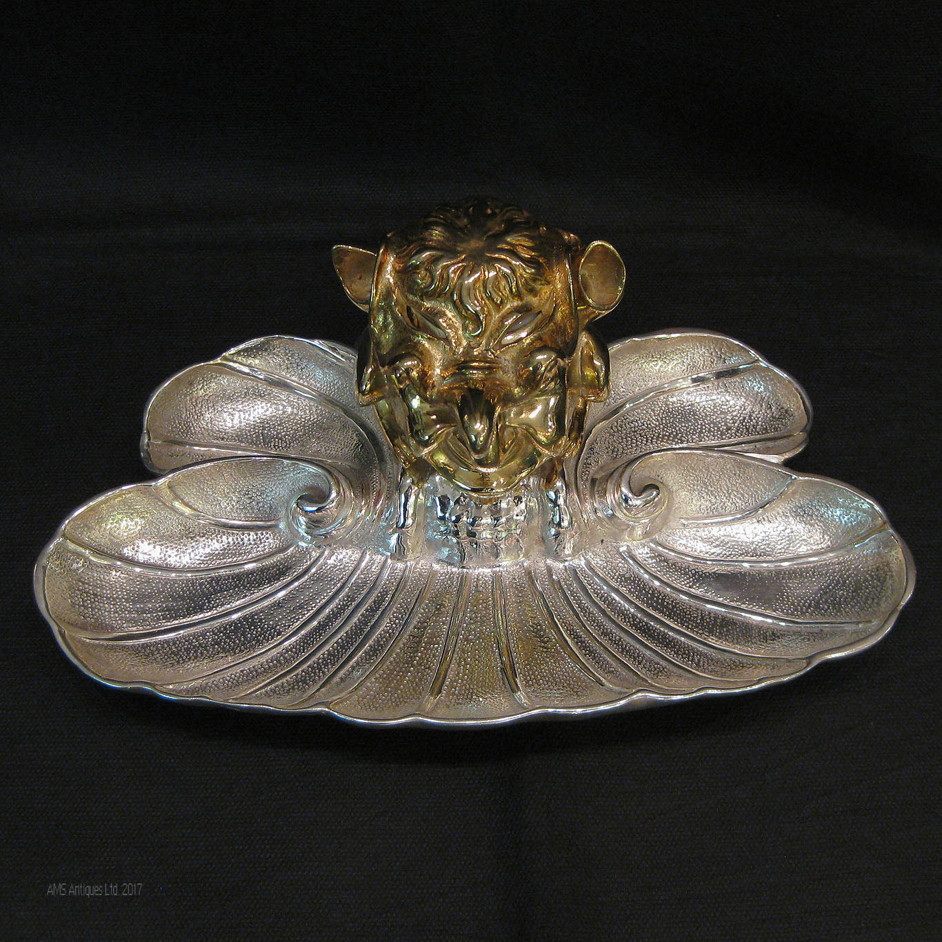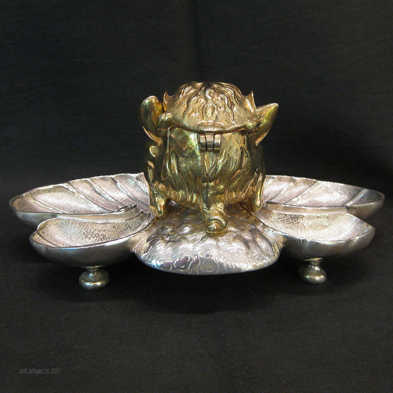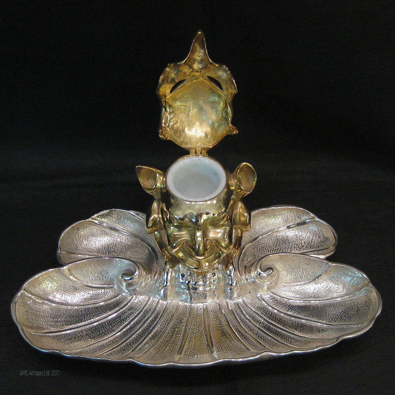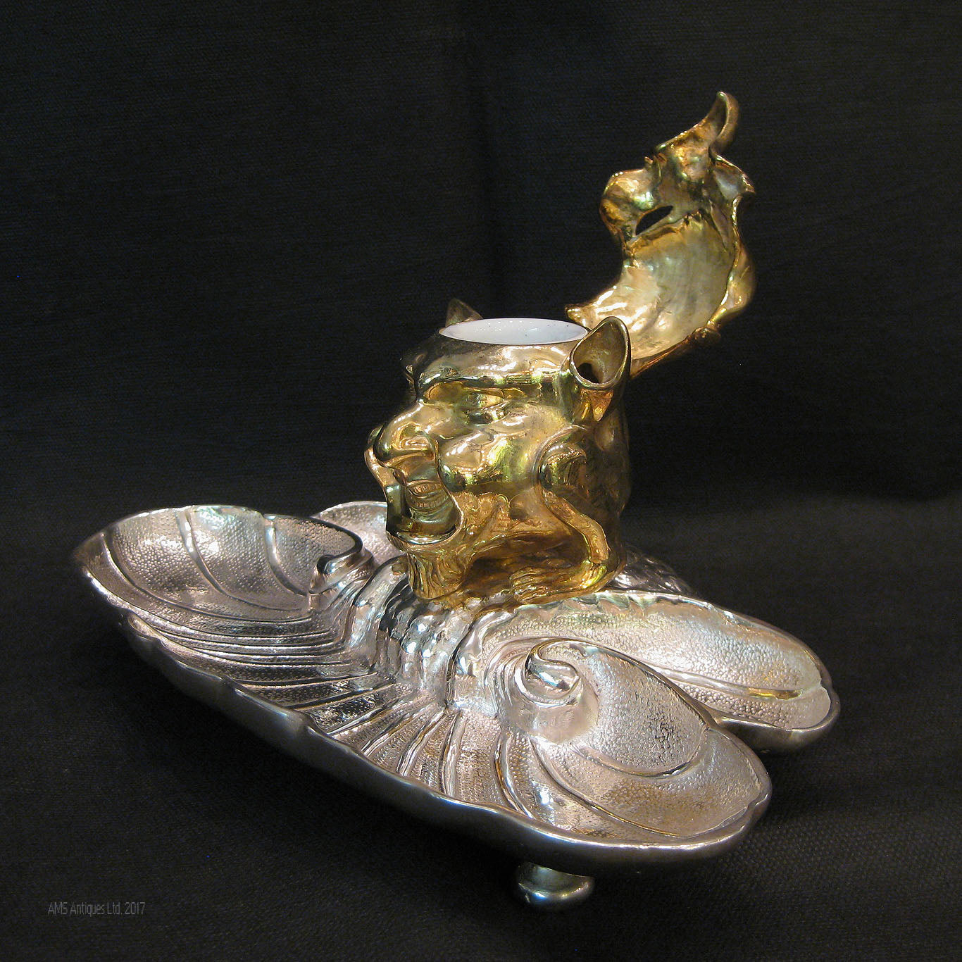 An unusual and collectable ink stand featuring a mythological Irish figure atop of a shell scrolled base.